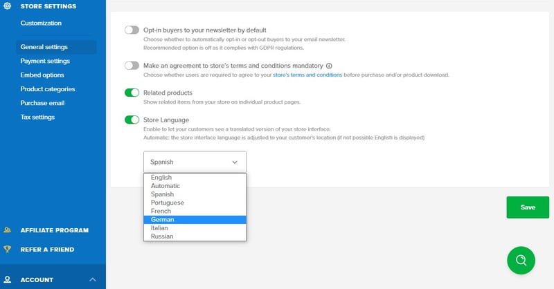 Die Shop-Sprache ist bei Sellfy auf Englisch voreingestellt. Für einen deutschen Shop müssen Sie also zunächst die Sprache ändern, wobei Deutsch glücklicherweise bereits zu den unterstützten Sprachoptionen zählt. Unter Store Settings > General Settings können Sie eine Shop-Sprache (Store Language) festlegen. Alle vorgefertigten Website-Texte werden dann automatisch übersetzt. Manuell eingegebene Texte, beispielsweise Ihre Seitennamen, müssen Sie natürlich selbst im Editor in der entsprechenden Sprache schreiben.