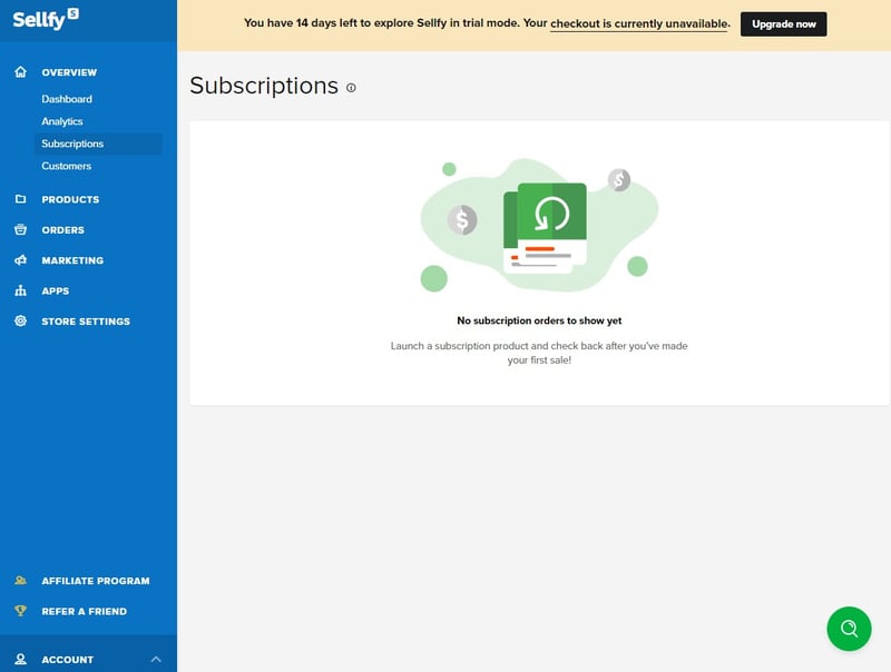 Ehe Sie diese Entscheidung treffen, führen auch wir Sie durch die verschiedenen Funktionen von Sellfy. Das Dashboard selbst macht dabei von Anfang an einen guten Eindruck. Die gesamte Navigation findet in der blauen Sidebar links statt, wo Sie zentral die Menüpunkte Übersicht, Produkte, Bestellungen, Marketing, Apps und Store-Einstellungen finden.