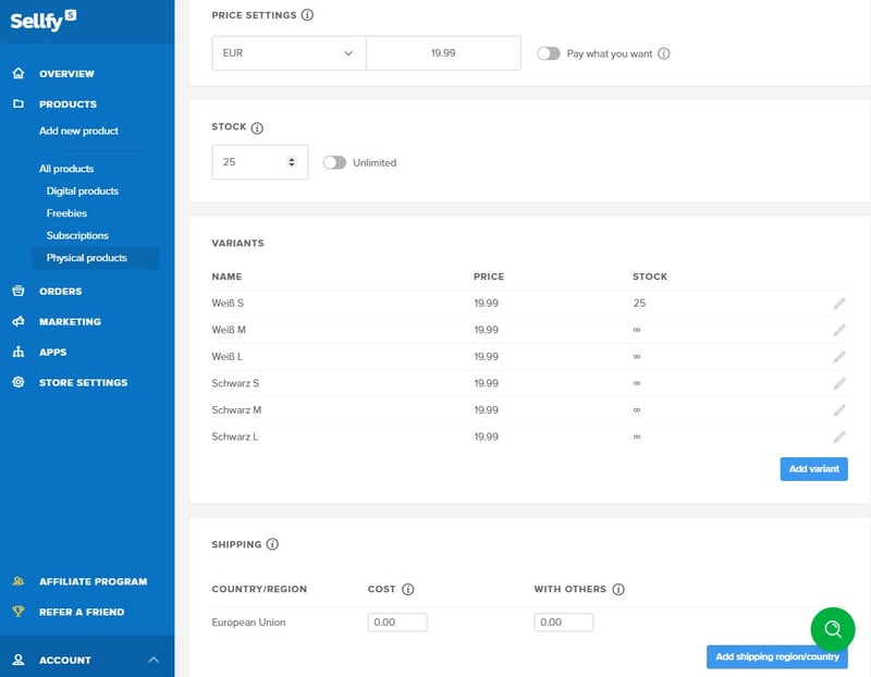 Wenn Sie physische Produkte ausliefern möchten, leistet Sellfy wenig Hilfestellung