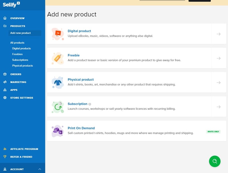 Ihre Produkte verwalten Sie im gleichnamigen Untermenü, wo sie in digitale Produkte (Digital products), kostenlose Produkte (Freebies), Abonnements (Subscriptions) und physische Produkte (Physical products) unterteilt sind. Wenn Sie ein neues Produkt hinzufügen, müssen Sie also zunächst auswählen, um welche Art es sich handeln soll.