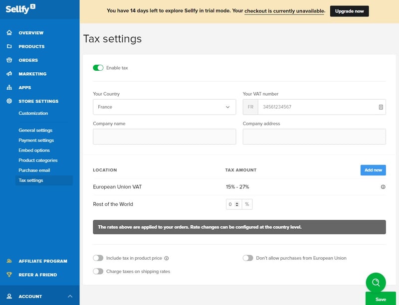 Steuereinstellungen finden Sie unter Store settings > Tax settings. Sellfy berechnet Steuern praktischerweise automatisch - doch leider können Sie keine manuellen Steuerregionen einrichten, wie bei vielen anderen E-Commerce-Plattformen. Dafür lässt sich auswählen, ob Brutto- oder Nettopreise angezeigt werden sollen, und Sie können auch den Versand besteuern.