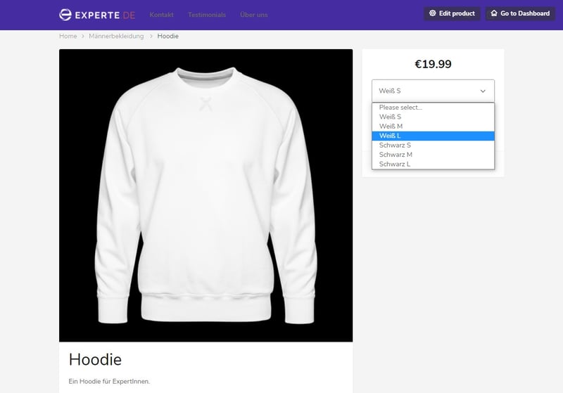 So können Sie die Varianten leider nicht kombinieren: Es ist beispielsweise nicht möglich, verschiedene Varianten für Größen und Farben zu erstellen, sodass Ihre Kunden die Größe in einem Kasten auswählen, die Farbe in einem anderen. Stattdessen müssen Sie für jede Unter-Variante eine eigene Variante anlegen - wie "Schwarz M", "Grau L", oder "Weiß S". Diese lassen sich auf der Produktseite dann per Dropdown-Menü auswählen.