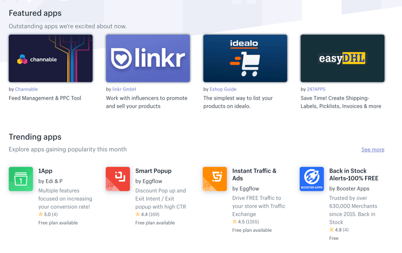 Im Vergleich zu vollen Drag-and-Drop-Editoren ist Ihre Freiheit bei Shopify etwas eingeschränkt. Allerdings sind Sie nicht auf die gebrauchsfertige Ausführung der Shopify-Benutzeroberfläche beschränkt: Im Bereich Apps gelangen Sie zum Shopify App Store, wo Sie viele zusätzliche - wenn auch oft kostenpflichtige - Apps hinzufügen können.