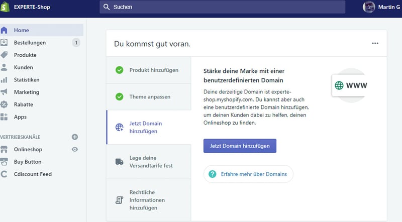 Das Dashboard von Shopify ist logisch strukturiert. Im Home-Bereich, wo Sie nach der Registrierung landen, führt Sie der erste Inhaltsblock durch die Schritte, die Sie für einen funktionierenden Online-Shop durchlaufen müssen. Hier können Sie erste Produkte hinzufügen (mehr dazu im nächsten Punkt), das Theme anpassen, eine Domain verbinden, Versandtarife festlegen und rechtliche Informationen hinzufügen.