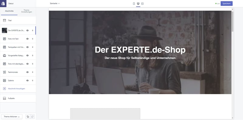 In der Mitte finden Sie stets eine Live-Vorschau Ihres Shops, wo Änderungen, die Sie in der Sidebar vornehmen, sofort sichtbar werden. So können Sie Ihren Shopify-Shop auch ohne große Design-Talente stimmig gestalten. Wenn Sie zufrieden sind, klicken Sie auf Speichern.