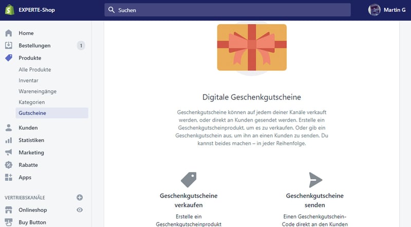 An Marketing-Funktionen hat Shopify nicht gespart. Im Produkt-Bereich können Sie digitale Gutscheine erstellen und entweder über Ihre Kanäle verkaufen oder direkt an Kunden senden. Für physische Geschenkkarten benötigen Sie hingegen eine (im Tarif kostenlose) Erweiterung: Mit Shopify POS können Sie Gutscheine bestellen und online verkaufen.