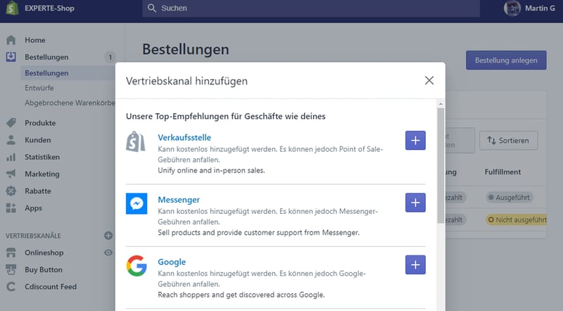 Links befindet sich ein Sidebar-Menü, wo Sie zwischen den Bereichen Home, Bestellungen, Produkte, Kunden, Statistiken, Marketing, Rabatte und Apps navigieren können. Hier finden Sie auch Ihre verschiedenen Vertriebskanäle, falls Sie Ihre Produkte neben Ihrem Shopify-Onlineshop noch über andere Kanäle anbieten.