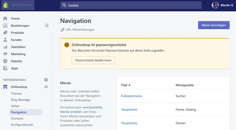 Um die Logik der Menüführung zu verstehen, sollten Sie sich ein paar Minuten Zeit nehmen und mit neuen Menüs herumspielen. Im Help Center von Shopify wird die Vorgehensweise noch anschaulicher erklärt.