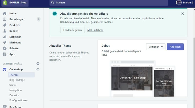 Wenn Sie bei Vertriebskanäle auf Onlineshop klicken, öffnet sich ein weiteres Untermenü, das als Mini-CMS Ihres Shops dient. Hier können Sie Blog-Beiträge erstellen und Ihrem Online-Shop Unterseiten hinzufügen. Zunächst sollten Sie natürlich das allgemeine Erscheinungsbild Ihres Shops unter Themes bearbeiten.