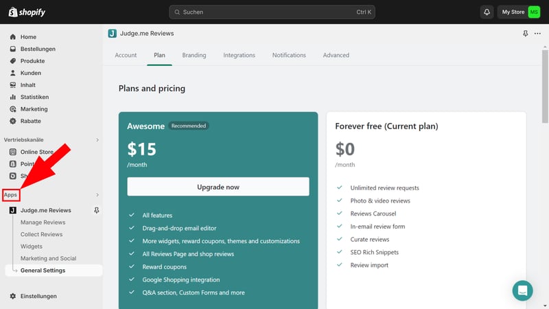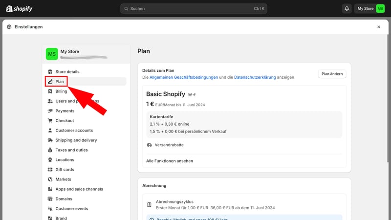 Schritt 1: Navigieren Sie in den Shopify-Einstellungen zum Bereich „Plan“.