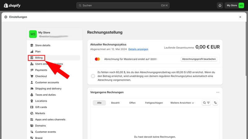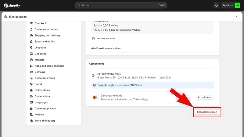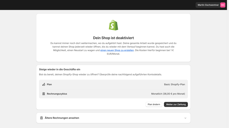 Sie können Ihren Shopify-Shop erst schließen, wenn Sie keine ausstehenden Rechnungen mehr haben. Stellen Sie also sicher, dass alle offenen Rechnungen an Shopify bezahlt wurden.