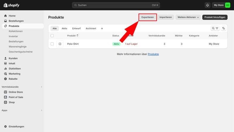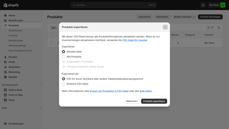 Damit Sie den Zugriff zu Ihren Daten auch nach der Shop-Schließung nicht verlieren, sollten Sie sie sichern und exportieren. Das geht mit fast allen wichtigen Daten – ob Bestellungen, Produkte, Kundenlisten oder Berichte. Klicken Sie im entsprechenden Bereich zunächst auf den „Exportieren“-Button: