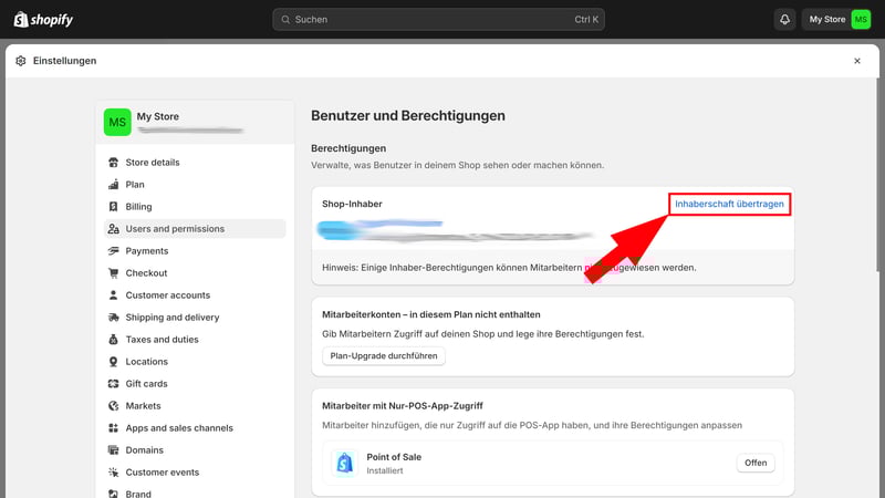 Schritt 6: Vollziehen Sie die offizielle Übertragung der Kontoinhaberschaft für den Shop. Dafür klicken Sie im Admin-Bereich unter Einstellungen > Benutzer und Berechtigungen auf „Inhaberschaft übertragen“ und folgen den Anweisungen.