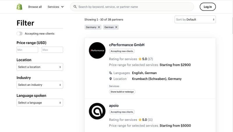 Die Suche nach der richtigen Agentur unterscheidet sich nicht groß von der Suche nach Freelancern: Auch hier können Sie sich im Shopify-Partnerverzeichnis, auf Portalen wie Upwork, in Ihrem Netzwerk und im Internet umsehen und umhören. Auf Google können Sie Ihre Suche mit entsprechenden Suchbegriffen (z. B. Standort, Kosten, Nische) eingrenzen.