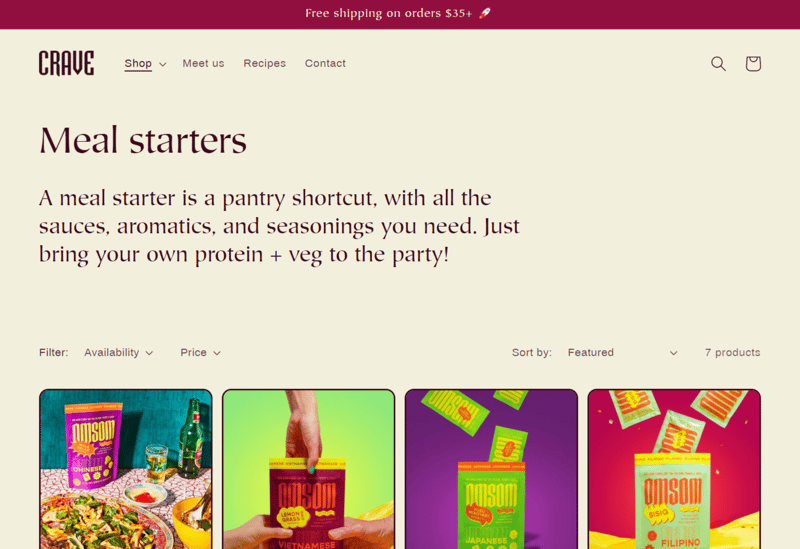 Crave ist eines der neuesten Shopify 2.0-Themes, das die Vorzüge der neuen Content-Engine voll ausnutzt. Es richtet sich ganz an Online-Shops im Bereich „Essen & Trinken“ – egal ob Restaurants, Lieferdienste oder Online-Lebensmittelläden.