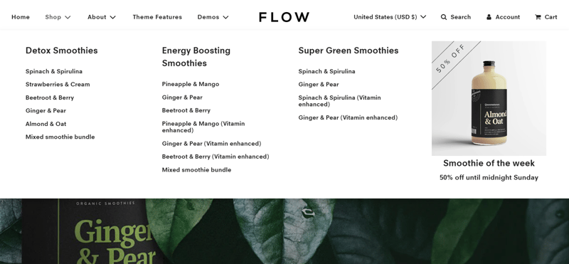 Flow ist besonders gut für Online-Shops im Bereich Lebensmittel und Getränke geeignet, lässt sich aber auch an andere Produktarten anpassen. Im intuitiven Navigationsmenü können Sie Ihre Produkte Sammlungen unterordnen und auch kleinere Kataloge groß in Szene setzen.