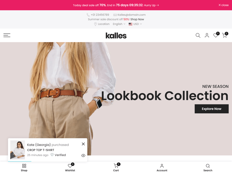 Das Theme eignet sich für Online-Shops jeder Art, Größe und Branche. Auf der Website des Anbieters finden Sie mehr als 50 Demo-Seiten, die mit dem Kalles-Theme gebastelt wurden. Minimalismus trifft dabei bei Kalles auf Funktionsvielfalt und dynamische Inhalte. Ihre Produktseiten können Sie beispielsweise mit Videos oder 3D-Modellen Ihrer Produkte aufpeppen.