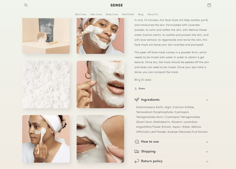Auch bei Sense handelt es sich um ein neues, 2022 veröffentlichtes 2.0-Theme. Es basiert auf Dawn, eignet sich aber besonders für Online-Shops in der Nische „Gesundheit und Schönheit“. Die Produktseiten sind beispielsweise noch etwas umfangreicher als bei Dawn, sodass Sie Ihre Beauty-Produkte gebührend in Szene setzen und beschreiben können.