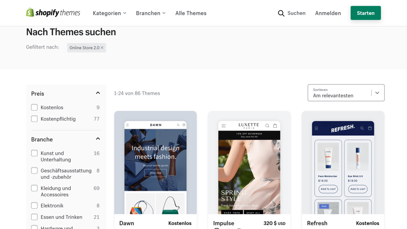 Bei Shopify stehen viele kostenlose und kostenpflichtige Themes zur Auswahl.