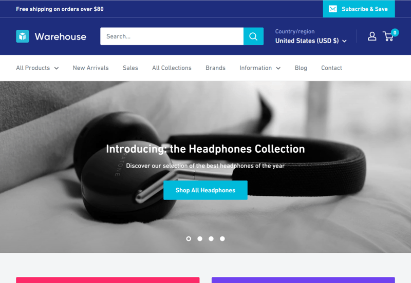 Der Elektronik-Bereich zählt nach wie vor zur beliebtesten Nische im E-Commerce-Bereich. Warehouse ist ein beliebtes Shopify-Theme, das für große Produktkataloge geeignet ist. Sie können Ihre Produkte beispielsweise in Sammlungen anordnen – etwa für Produktkategorien wie „Kopfhörer“, „Smart-TVs“ oder „Spielekonsolen“.