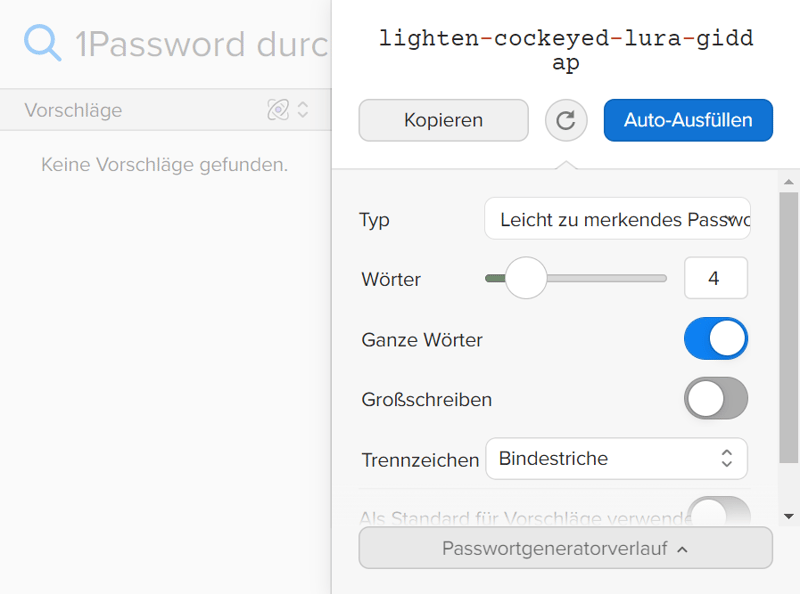 Wie jeder gute Passwort-Manager verfügt auch 1Password über einen Passwort-Generator. Besonders macht jenen, dass Sie neben den üblichen Einstellungen zu Symbolen und Ziffern auch Passwort-Phrasen erstellen können. Bisher ist dies allerdings auch bei deutscher Programm-Einstellung nur mit englischen Wörtern möglich.