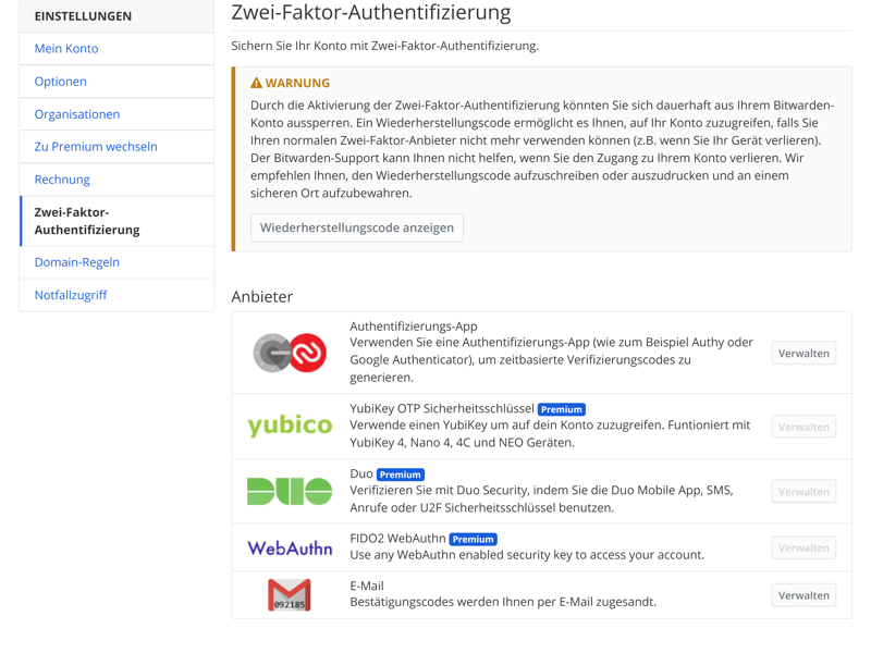 Auch Zwei-Faktor-Authentisierung gehört zur Standard-Ausstattung: Nutzer der kostenlosen Version können dabei Authentifizierungs-Apps wie Google Authenticator und Authy verwenden oder per E-Mail den Login verifizieren. Premium-Kunden haben mehr Optionen, inklusive Yubikey und Duo Security.