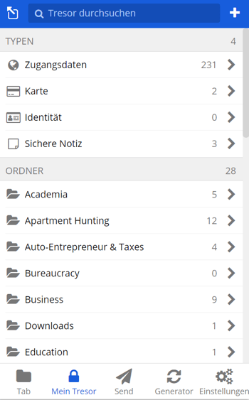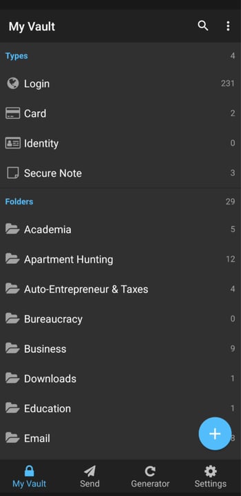 Die mobile Version von Bitwarden ist dem Desktop-Kollegen überaus ähnlich. Im Tresor, dem Hauptfenster, sind alle Datensätze, Ordner und Sammlungen aufgelistet. Im Menü unten können Sie zudem einfach zum Passwort-Generator und den Einstellungen wechseln.