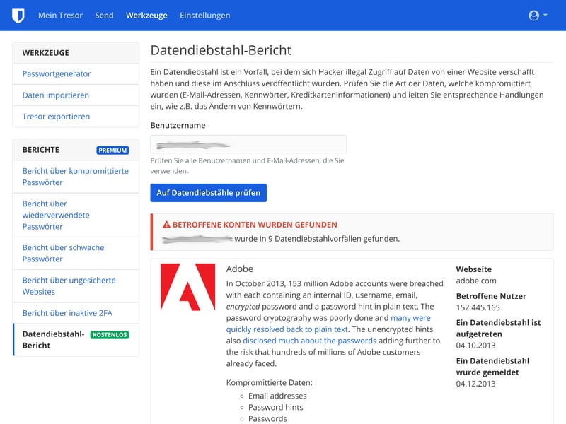 Mit dem Datendiebstahl-Bericht finden Sie schnell heraus, ob Ihre Konten von möglichen Leaks betroffen sind