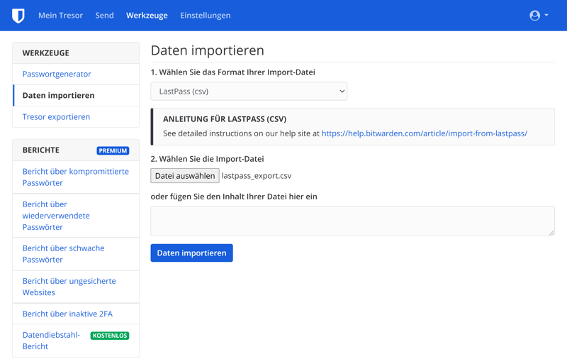 Für den Import müssen Sie in den Web-Tresor wechseln