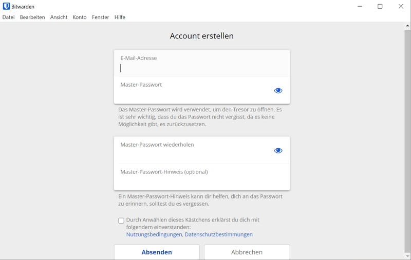 Bitwarden ist für viele Plattformen erhältlich, im Download-Bereich müssen Sie deshalb zunächst die entsprechende Install-Datei auswählen. Sie können bereits auf der Website einen kostenlosen Account erstellen, oder diesen Schritt später im Desktop-Client vornehmen. Wie immer müssen Sie dabei zunächst ein Master-Passwort festlegen, das von nun an als Schlüssel zu all Ihren anderen Passwörtern fungiert.