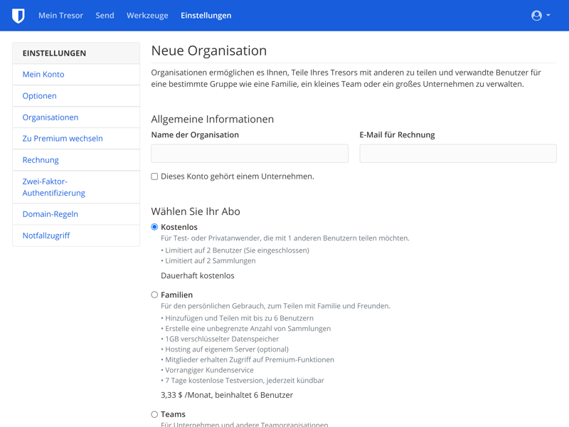 Leider behandelt Bitwarden die Funktion, die bei vielen Passwort-Managern mittlerweile zum Standard gehört, als kostenpflichtigen Zusatz. Als Administrator können Sie eine Organisation kostenlos erstellen, die aber auf zwei Nutzer beschränkt ist. Andere Optionen kosten monatlich, ab drei Dollar pro Monat.