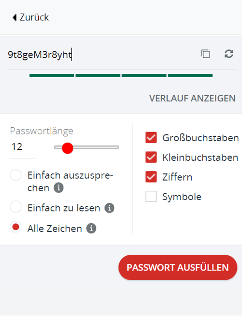 Mit dem Passwort-Generator in der Browser-Erweiterung können Sie kinderleicht sichere Passwörter ganz nach Ihren Vorgaben in Bezug auf Länge, Zeichen und Komplexität erstellen. Befinden Sie sich bereits in einem Anmeldeformular, können Sie das erstellte Passwort zudem per Mausklick ins entsprechende Feld kopieren – und gleich in der App speichern. Ganze Passwort-Phrasen lassen sich mit dem Generator hingegen nicht erstellen.