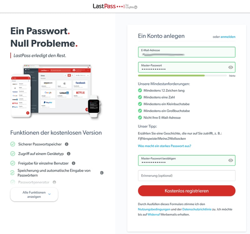 Die Anmeldung und Einrichtung von LastPass geht schnell vonstatten. Zunächst müssen Sie einen Account erstellen und im Zuge dessen auch gleich Ihr Master-Passwort anlegen. Als Zugang zu Ihrem LastPass-Tresor ist es das einzige und letzte Passwort (das „LastPass“ also), das Sie je benötigen werden. Hier gibt das Programm genaue Vorgaben: Ihr Passwort muss mindestens 12 Zeichen lang sein und mindestens eine Zahl, einen Klein- und einen Großbuchstaben enthalten.