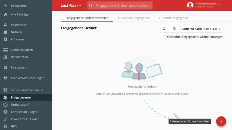 Sie können Ihre Passwörter auch mit anderen LastPass-Nutzern teilen. Das Freigabecenter bietet die Möglichkeit, entweder einzelne Einträge oder ganze Ordner für andere zugänglich machen. Dabei können Sie auswählen, ob diese Nutzer das Passwort nur verwenden, oder es auch einsehen können. Ganze Ordner lassen sich allerdings nur im Familien-Tarif freigeben.