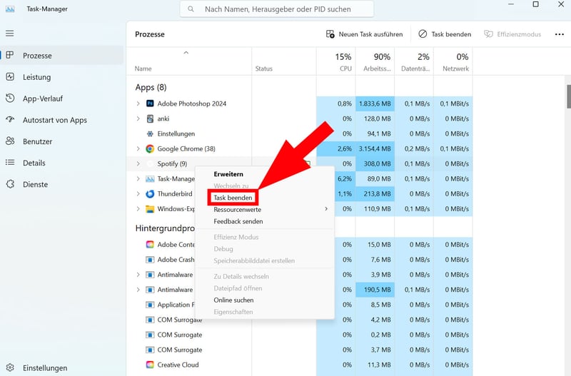 Schritt 3: Klicken Sie mit der rechten Maustaste auf ein aktuell nicht benötigtes Programm aus und wählen Sie „Task beenden“.