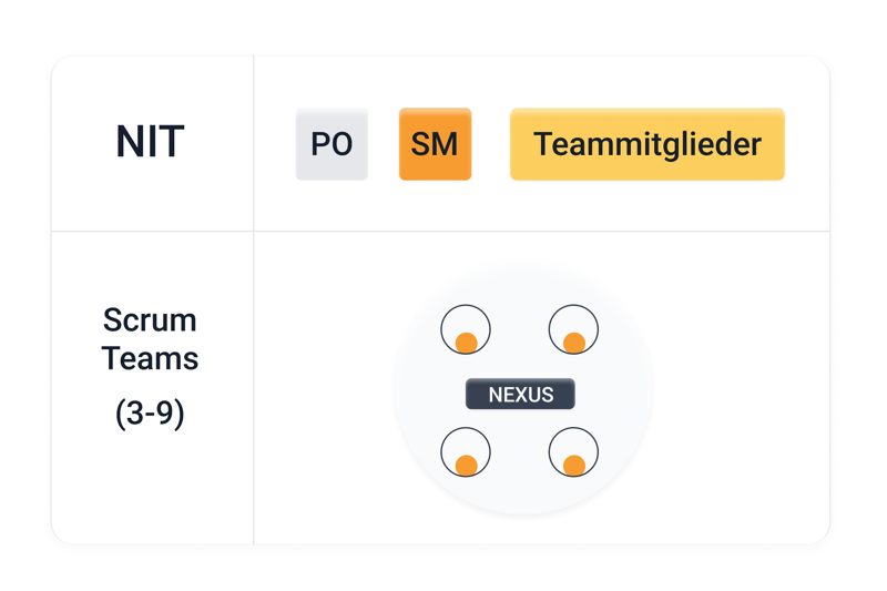 Die Scrum Teams besitzen jeweils einen Scrum Master und bilden in der Gesamtheit ein Nexus. Diesem ist ein Nexus Integration Team (NIT) zugeordnet, welches einen Product Owner, einen Scrum Master und einige Teammitglieder besitzt.