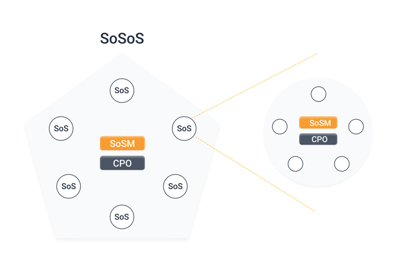 Bis zu fünf Scrum-Teams können sich zu einem übergeordneten Team, dem Scrum of Scrum (SoS), zusammentun. Zusätzlich zu den bereits bestehenden Rollen kommen zwei weitere hinzu: der Scrum of Scrum Master (SoSM) und der Chief Product Owner (CPO). Neue Abstimmungstermine und Prozesse sorgen für gute Kommunikation unter den Teams.