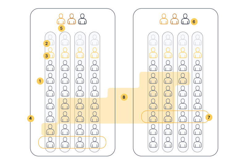 Tribe: Mehrere Squads, die im gleichen Funktionsbereich arbeiten, bilden einen Tribe, der aus 40 - 150 Mitarbeitern bestehen kann.