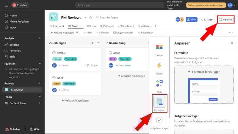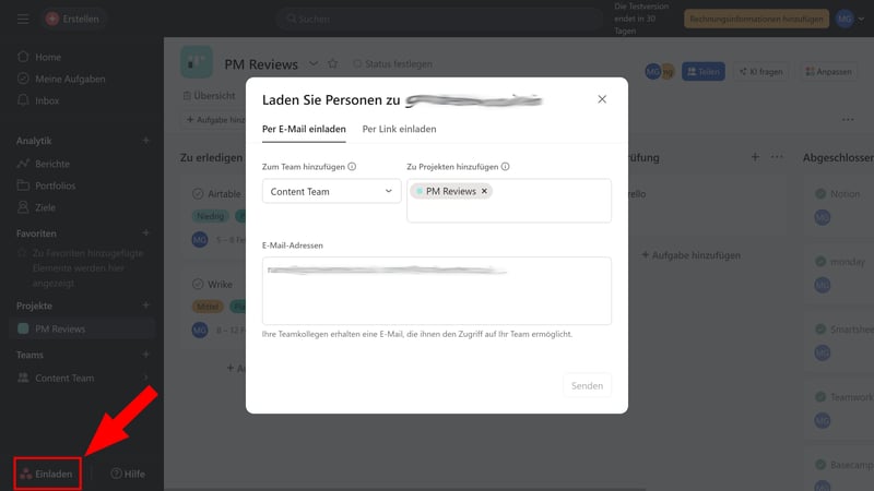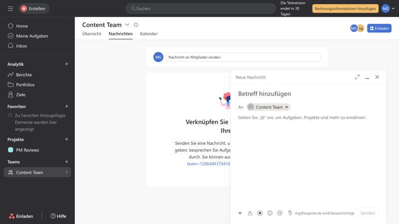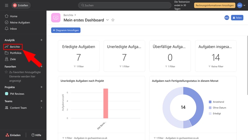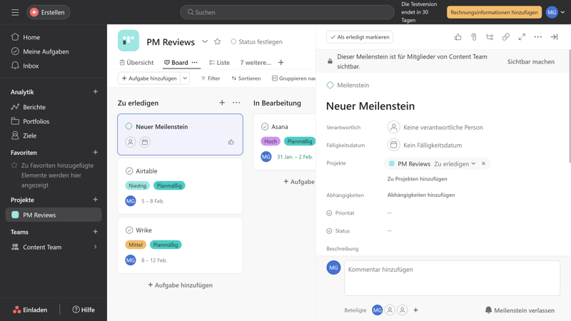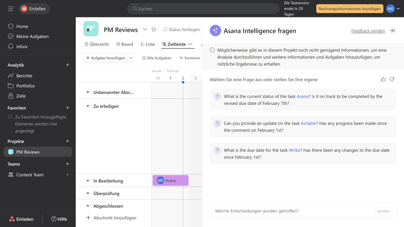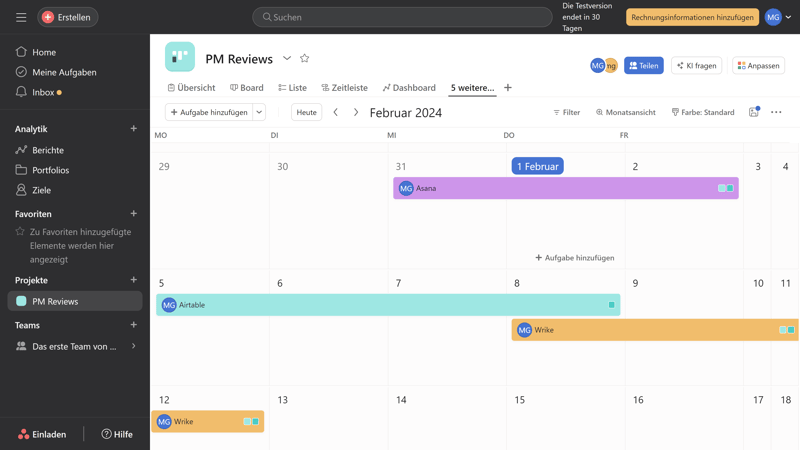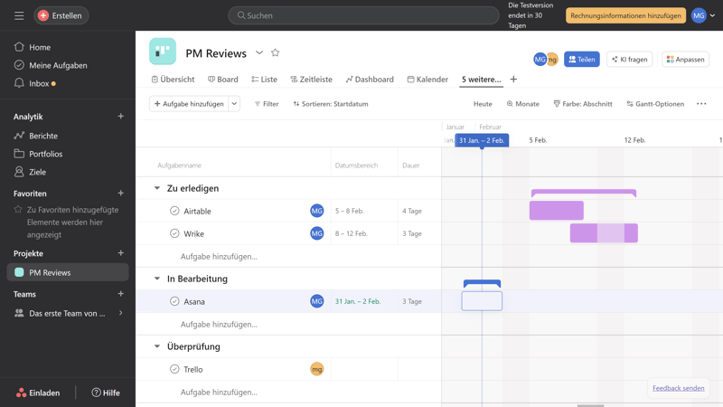Nach der Registrierung startet automatisch eine 30-tägige Testphase. Sie können also erst einmal alle Premium-Funktionen von Asana kostenlos ausprobieren. Am Ende werden Sie automatisch zur Gratis-Version herabgestuft, wenn Sie sich nicht für ein Upgrade entscheiden.