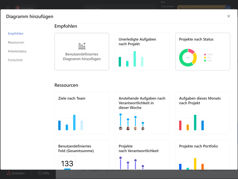 Der Advanced-Tarif bietet noch mehr Funktionen, wie Portfolios, Ressourcenmanagement, erweiterte Berichte und Genehmigungen. Zudem sind bis zu 25.000 Automatisierungen pro Monat möglich.