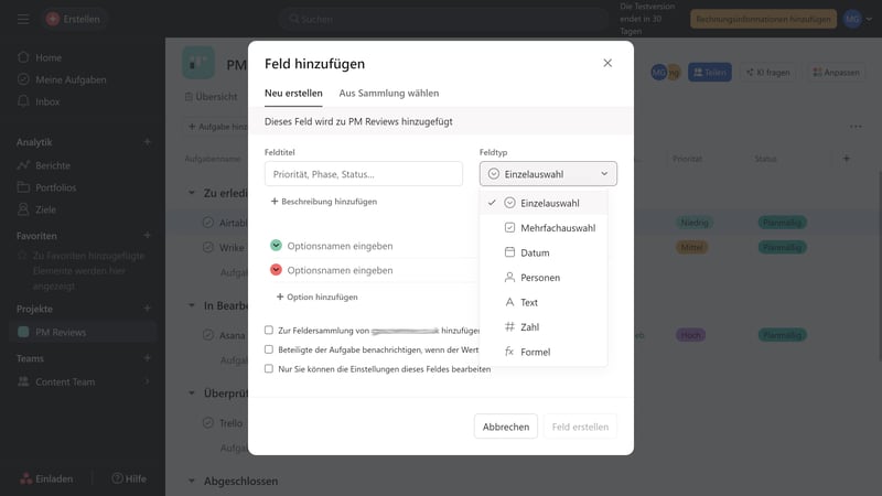 Asana bietet vergleichsweise wenige Optionen bei der Erstellung benutzerdefinierter Felder, was die Personalisierung von Aufgaben einschränken kann.