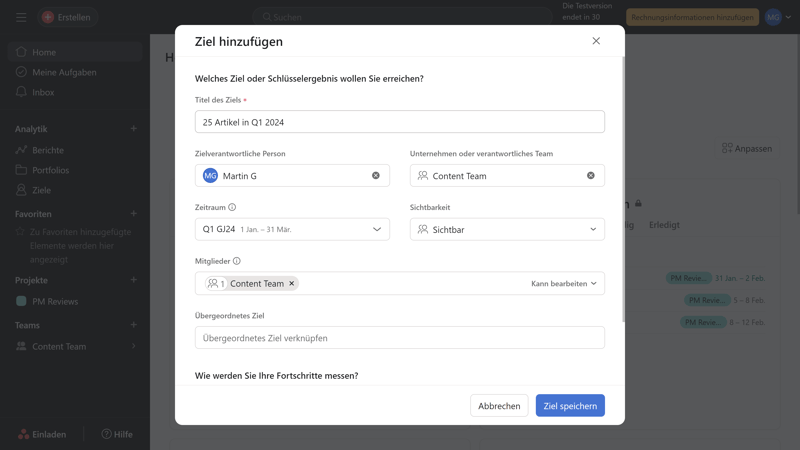 Ziele: Sie können übergeordnete Ziele für das gesamte Unternehmen oder einzelne Teams erstellen, etwa ein Wachstum der Besucherzahl Ihrer Website um einen bestimmten Faktor, auf die Sie mit Ihren Projekten hinarbeiten.