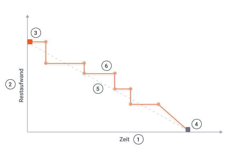 Ist-Verlauf: Der tatsächliche Verlauf ist dieser Linie abzulesen. Die Linie kann treppenförmig sein oder fließend verlaufen – was dies bedeutet, erklären wir in einem späteren Abschnitt. Das wichtigste: An dieser Linie lässt sich ablesen, wie hoch der Restaufwand zum jeweiligen Zeitpunkt ist.