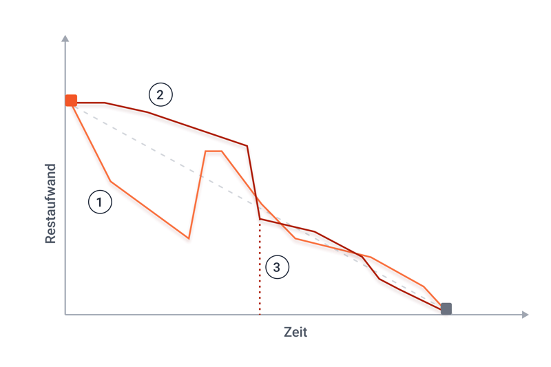 Soll-Verlauf: Diese Linie stellt die idealtypische Annahme dar, dass ein Team die Arbeit gleichmäßig abarbeitet, der Restaufwand also gleichmäßig sinkt. In der Praxis werden Sie eine solche Linie jedoch selten finden.