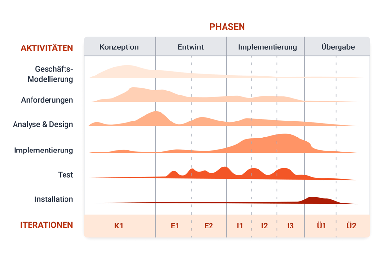 RUP vereint iteratives und lineares Vorgehen in einem Modell. Während des Projektes werden feste Phasen durchlaufen. Dabei können alle Phasen (außer die Konzeption) mehrfach durchlaufen werden. Die eigentlichen Aktivitäten des Projektes laufen dabei jedoch alle parallel und unterscheiden sich lediglich in ihrer Intensität innerhalb der Phasen.