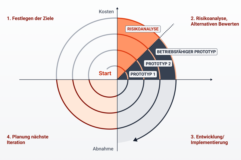 In diesem Modell durchlaufen Produkte und Entwicklungen mehrere Iterationen. Eine Iteration dauert in etwa sechs Monate, in dieser Zeit werden vier Phasen durchlaufen: Planung, Risikoanalyse, Entwicklung und Bewertung. Bei diesem Modell liegt der Fokus auf der sorgfältigen Risikoanalyse, bei welcher Experten eingebunden sind.