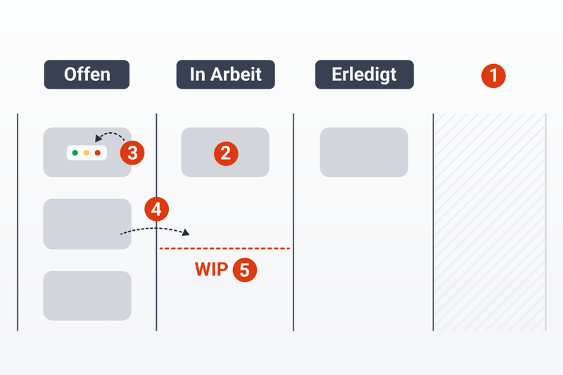 WIP-Limit: WIP steht für Work-in-Progress. Das Limit bezieht sich darauf, dass lediglich eine Höchstzahl an Aufgaben im aktuellen Status oder der aktuellen Spalte liegen dürfen. Als Beispiel: Es dürfen nur XY Aufgaben in Bearbeitung und nur XY Aufgaben im Teststadium liegen. Damit kann man einer Überlastung des Teams vorbeugen. Auch unproduktives Multitasking hat damit ein Ende.
