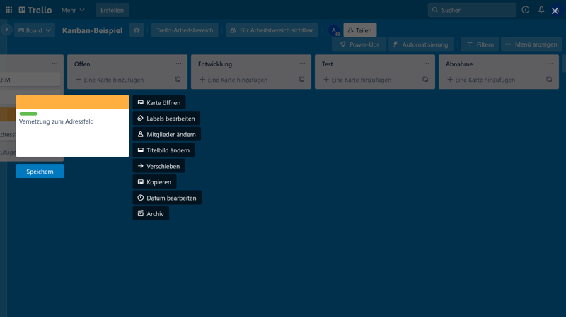 Die Aufgabenkarten lassen sich in diesem Zug Teammitgliedern zuweisen und mit Symbolen, weiteren Informationen, Fristen oder Farben versehen. So wird das Board noch übersichtlicher.