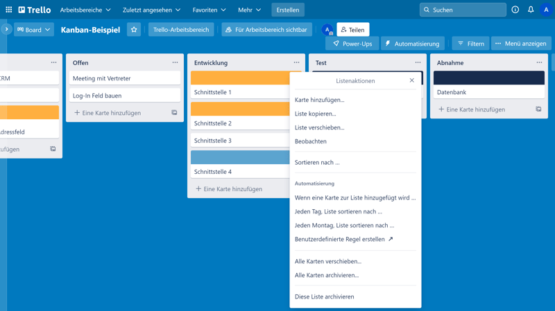 Mit Trello können Sie beispielsweise bestimmten Aufgaben oder Workflowphasen folgen, Benachrichtigungen einstellen und eigene Regeln kreieren. Damit können Sie für bestimmte Spalten WIP-Limits oder andere Aktionen in Gang setzen. Solche automatisierten Vorgänge können in der Praxis eine enorme Zeitersparnis darstellen.