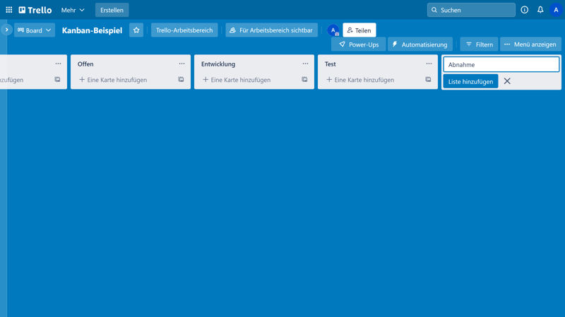 Die einzelnen Spalten (oder Listen, wie Trello sie nennt) lassen sich mit einem Klick erstellen und frei benennen. Jede Spalte entspricht einem Schritt in Ihrem Arbeitsprozess, legen Sie diese also entsprechend fest.